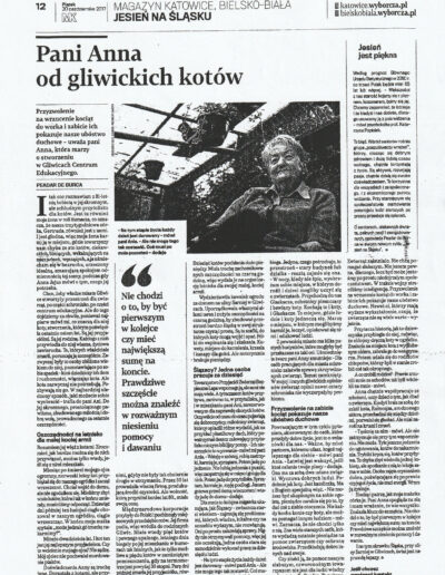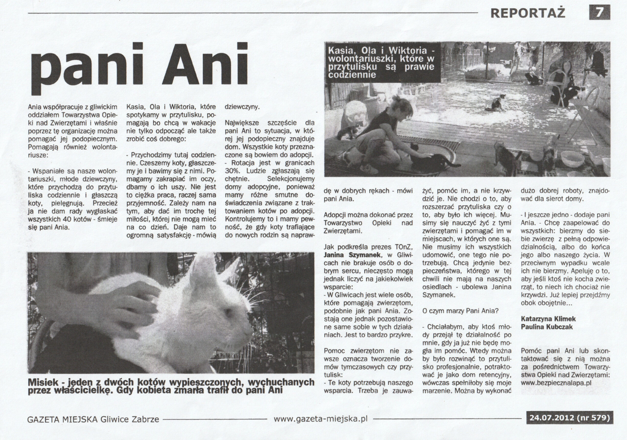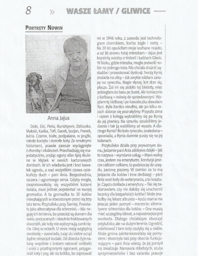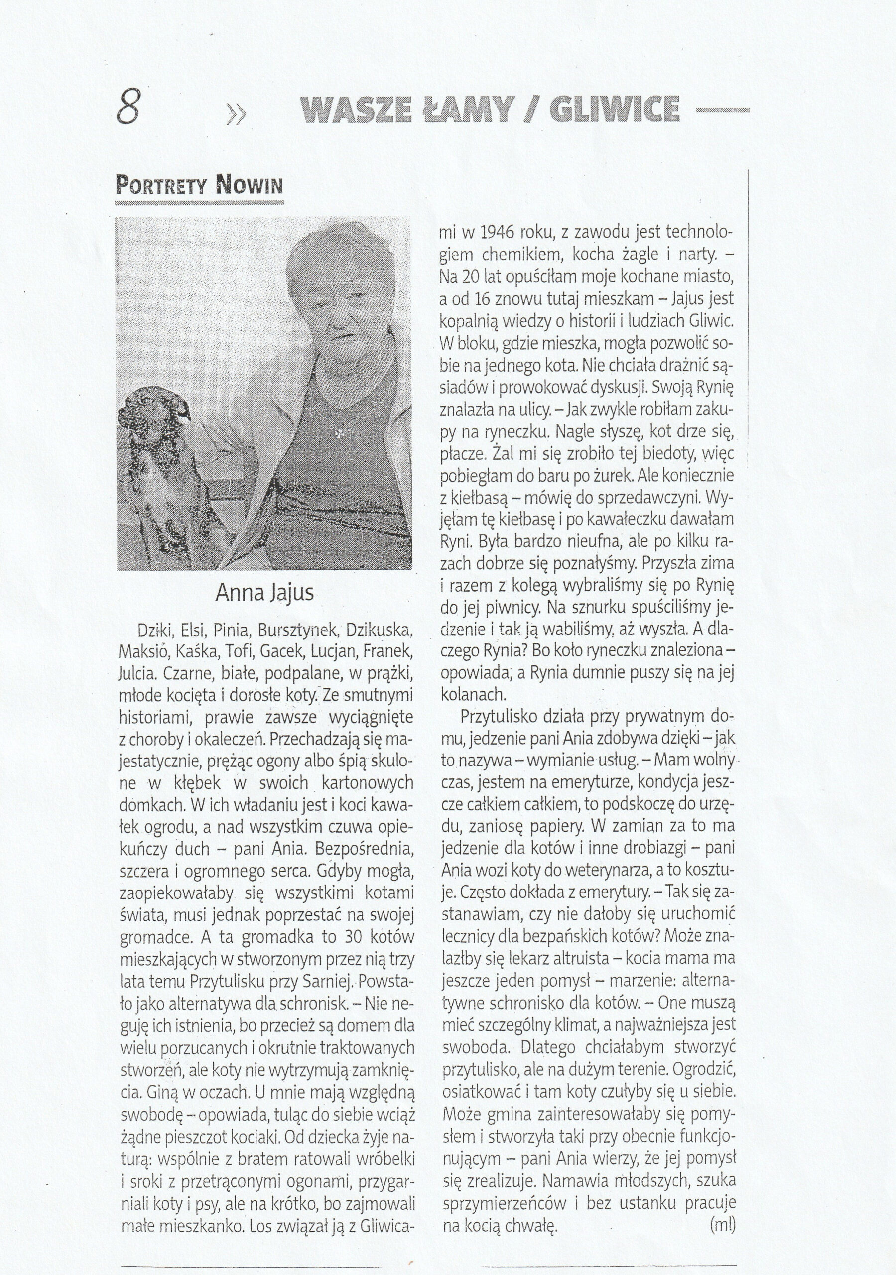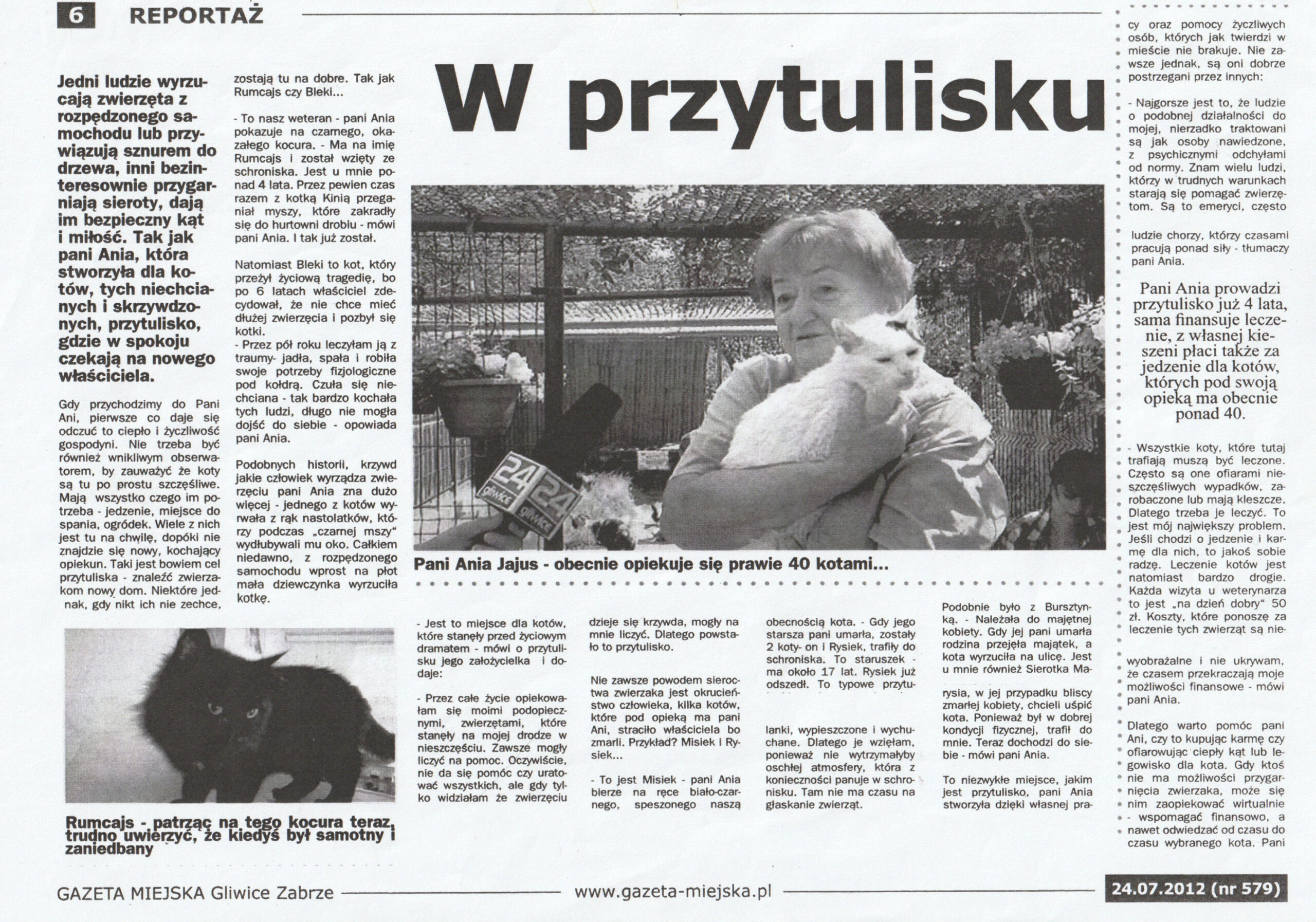 Porzucone, niechciane, niekochane u niej znalazły spokój i miłość. W chwili obecnej w przytulisku przebywa ponad 20 kotów (głównie koty „pośmiertne”) i jak mówi pani Anna: “za każdym z nich stoi nieszczęśliwa historia”... To jednak nie wszystkie zwierzęta którymi opiekuje się pani Ania. Na co dzień dokarmia około 200 kotów wolnożyjących, oraz wspomaga karmą wielu tzw. społecznych karmicieli.