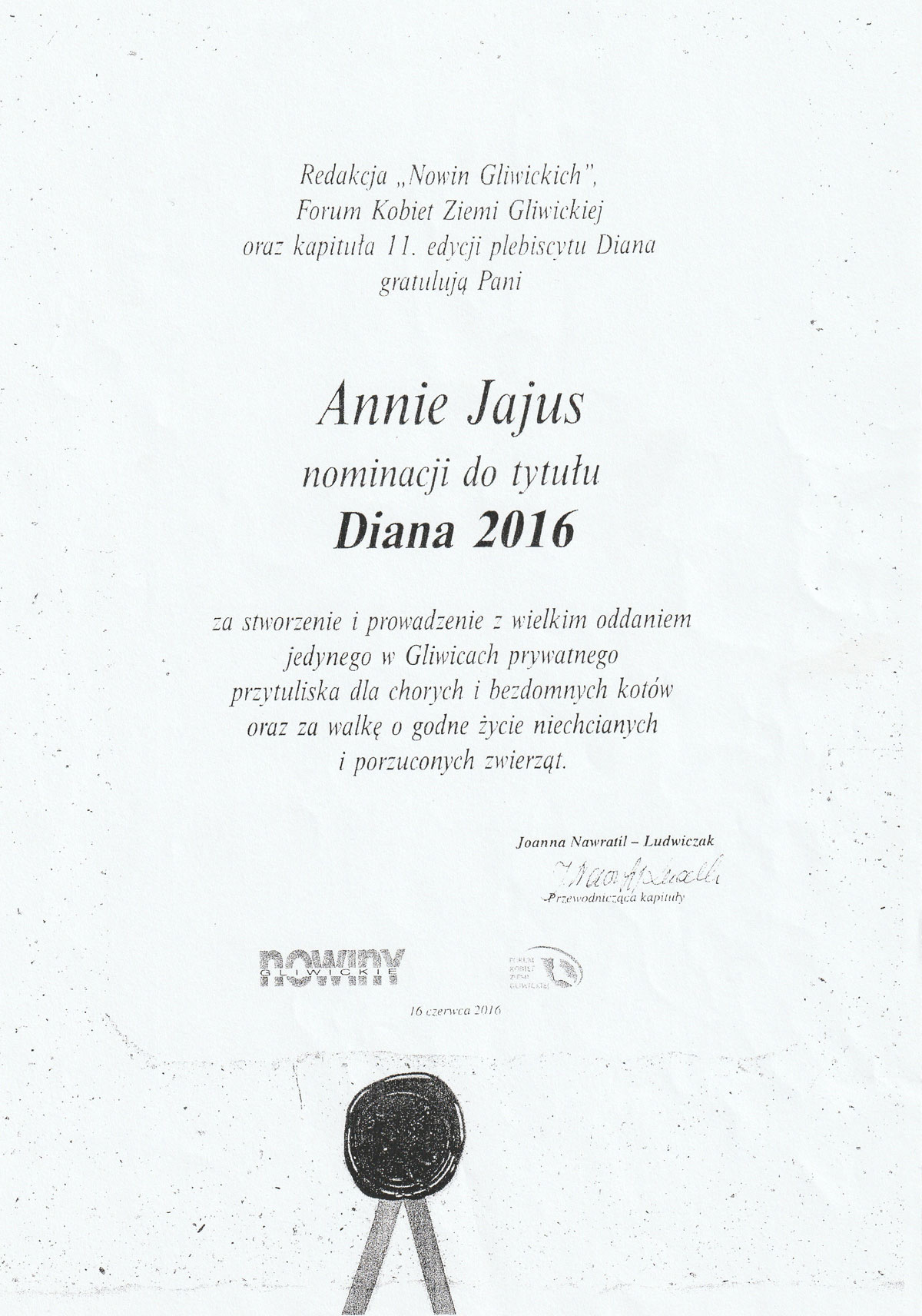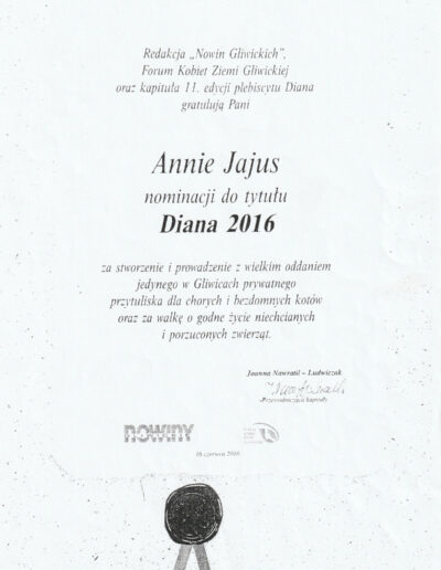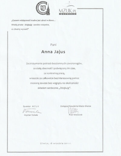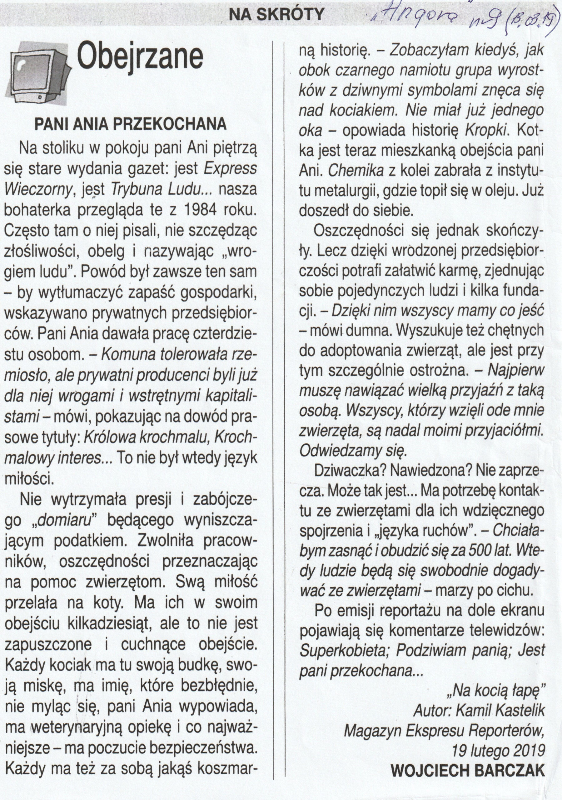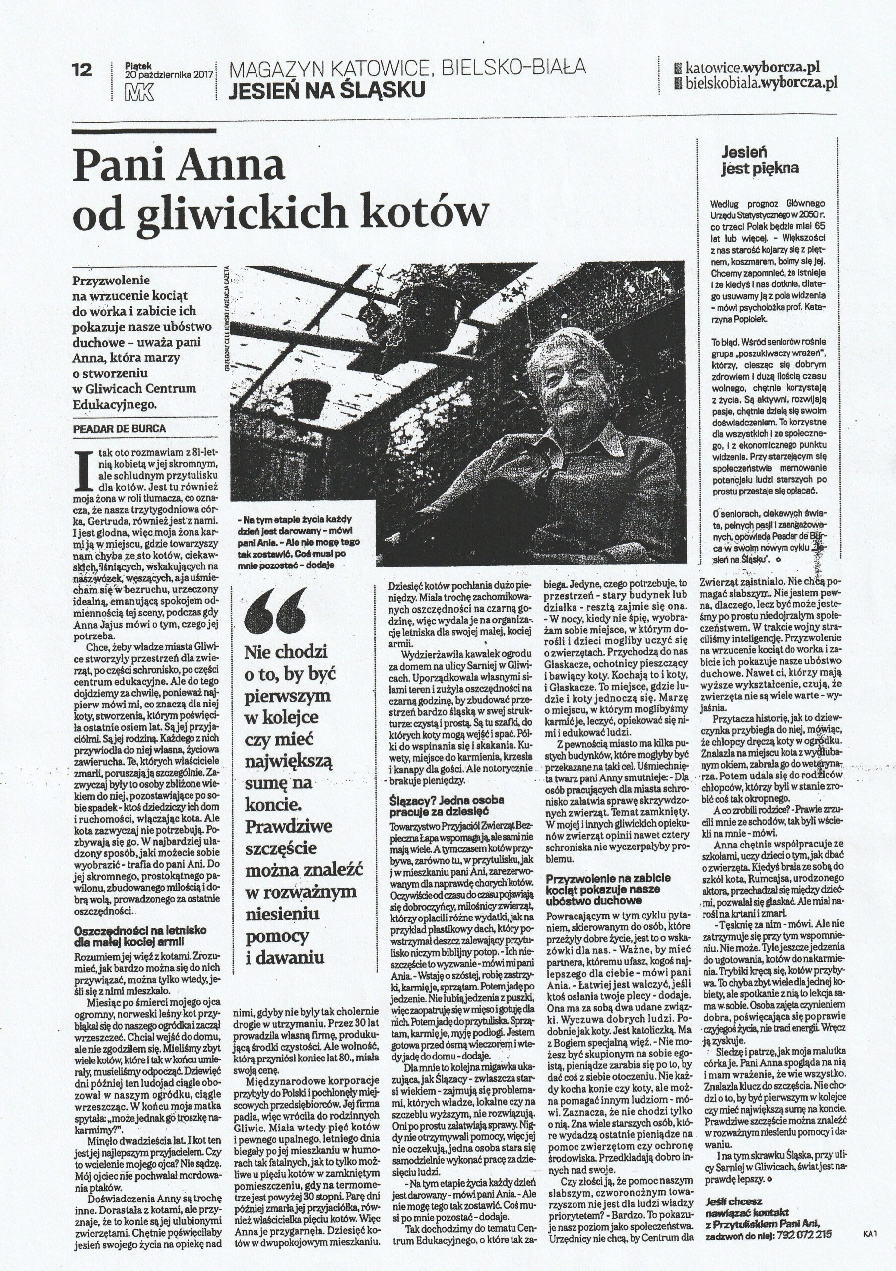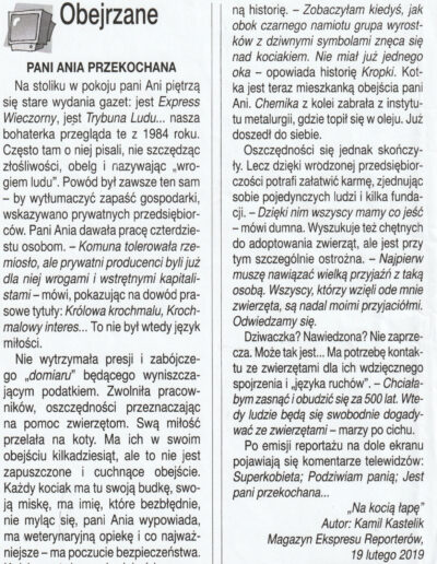 Porzucone, niechciane, niekochane u niej znalazły spokój i miłość. W chwili obecnej w przytulisku przebywa ponad 20 kotów (głównie koty „pośmiertne”) i jak mówi pani Anna: “za każdym z nich stoi nieszczęśliwa historia”... To jednak nie wszystkie zwierzęta którymi opiekuje się pani Ania. Na co dzień dokarmia około 200 kotów wolnożyjących, oraz wspomaga karmą wielu tzw. społecznych karmicieli.